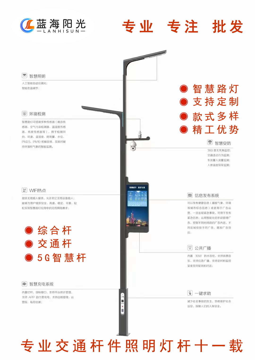 “多功能綜合桿”,又稱“智慧多功能桿”,是集智能照明、視頻監控、交通管理、環境檢測、無線通信、信息交互、緊急求助等功能于一體的公共基礎設施。是建設新型智慧城市的重要載體。藍海陽光智慧多功能綜合桿可掛載5G通信基站、WiFi無線網絡、智能節能路燈、智能安防監控、智能人臉識別、交通引導與指示、音響和廣播電視、無人機充電、汽車充電樁、停車感應支付、無人駕駛引導等設